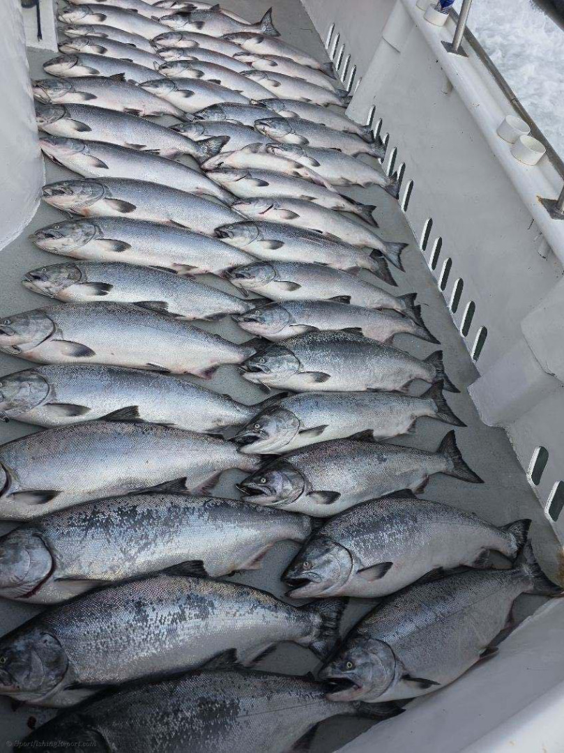 We seen some absolute epic salmon fishing today! Some of the largest grade of salmon I could ever remember on a single trip. Lots of heartbreak for many people.. broken lines and fish escaping. At the end of the day we finished up with the fish box is completely filled to the top with no room left to spare.