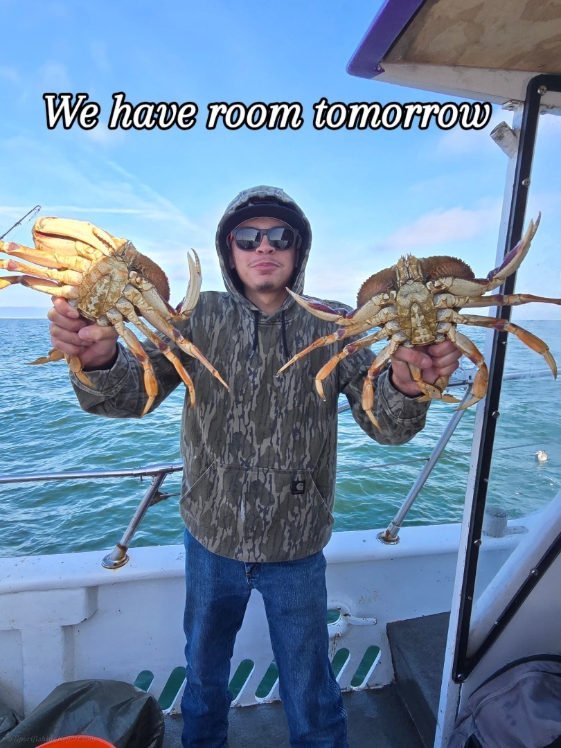 A fantastic day out—230 jumbo crab, 230 rockfish, and 2 lingcod landed. If you’ve been waiting for the perfect time to join us, this weekend is ideal. We have room Friday, Saturday, and Sunday.