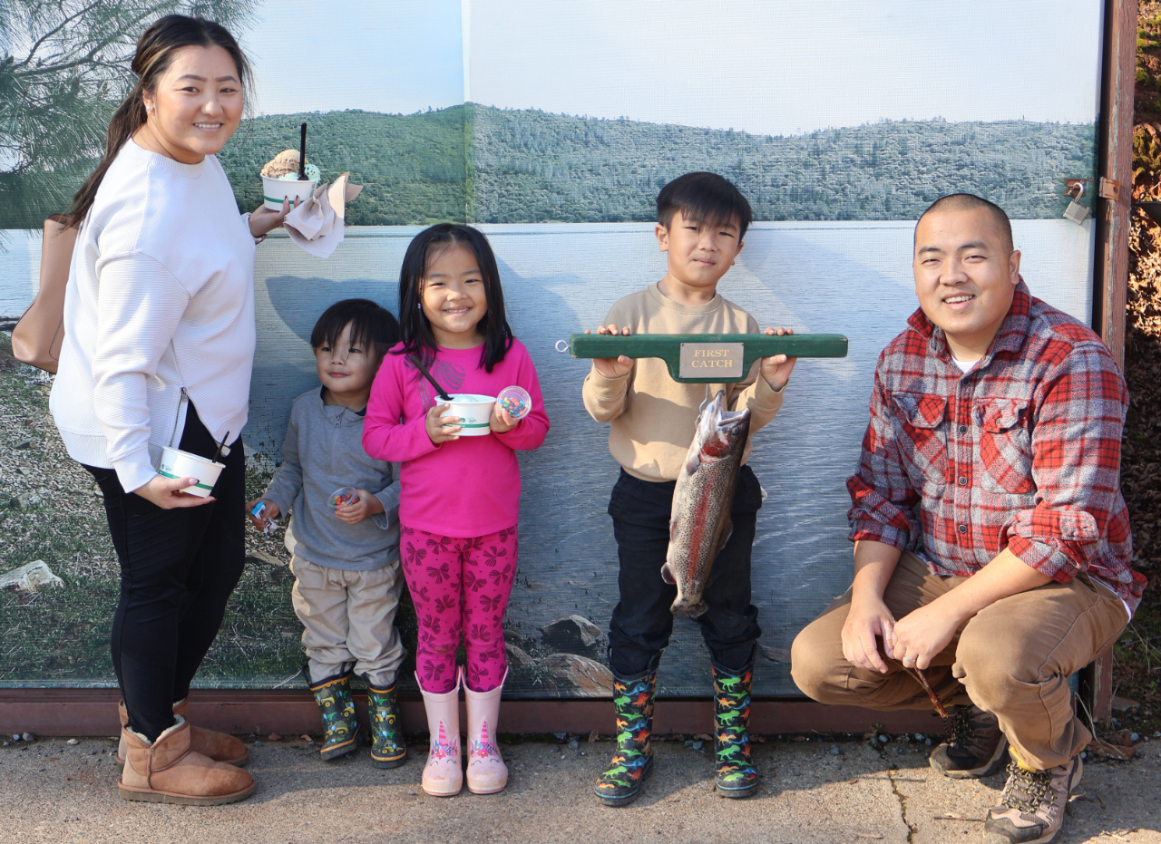Keng Her and family are proud to show off a first fish, caught at Collins Lake, using PowerBait near the Rental Dock…. and also some famous Collins Lake Ice Creams!