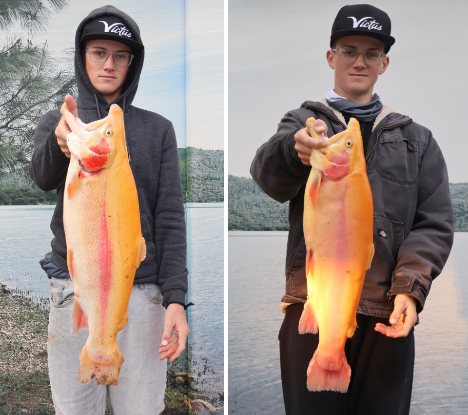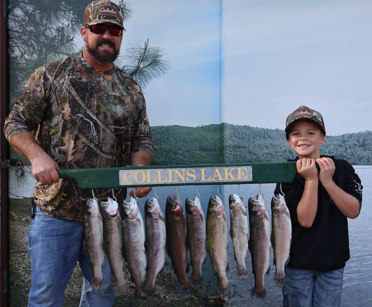 Luke and Jamie maxed out the stringer with a double limit of rainbow trout, not a single small fish hanging there. The brought in their haul using PowerBait and trolling flies.