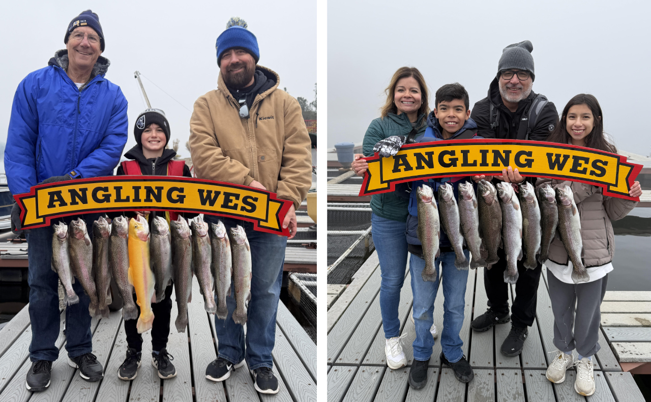 “Angling Wes” Wes Ward send in some picture of what he and his clients have been up to- looks like smiles and fun and lots of fish! Wes reports recently 8 to 10 fish most days up to 5 pounds- lots of surface action with Garlic PowerBait in 3′ to 12′ of water. He notes that trolling had dropped off but can pickup quickly as soon as the weather turns (AnglingWes.com or 916-342-1217) .