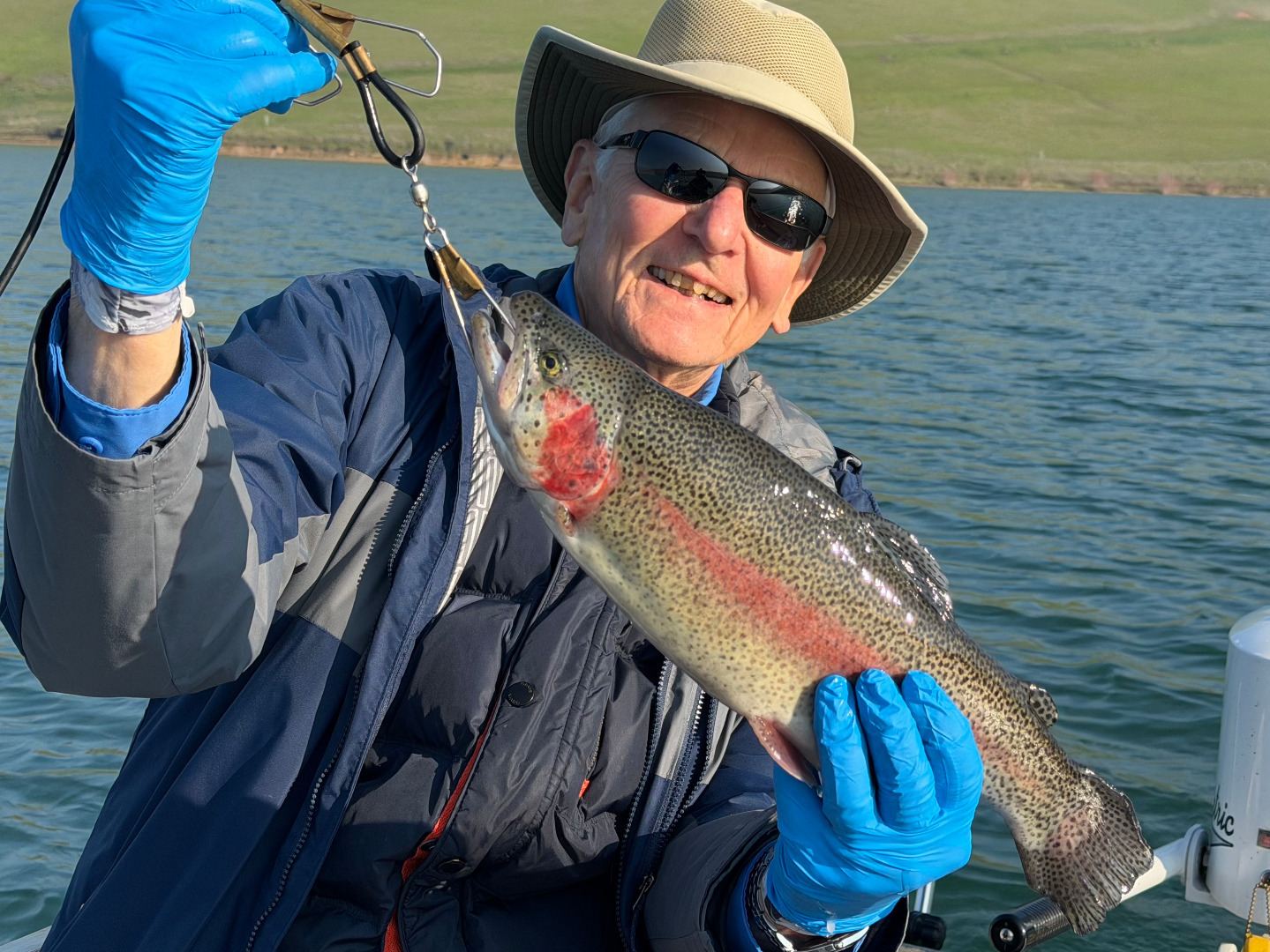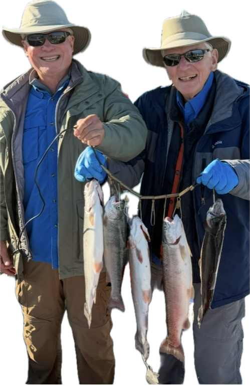 After a successful day of trolling for Trout on Los Vaqueros Reservoir (LVR) on 1/12/26, Paul Clouse joined Al Hurwitz on 1/15/26 for another LVR fishing outing. We trolled for Rainbows and caught seven, releasing two and keeping five. Pictured here are Al with a 2.5 pound Mt. Lassen Trout, Al and Paul holding a 3.3 pounder, and Al and Paul holding a stringer of the five Lassens. The aggregate weight of the five fish was 12.75 pounds. We caught the fish in both Howden and East Coves, trolling jointed Rapalas. They were in 18-25 foot water columns, and were about five to seven feet below the surface.