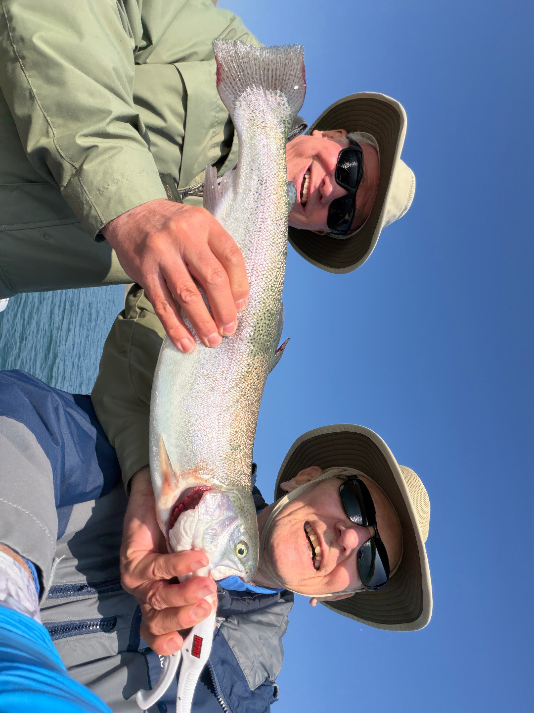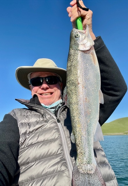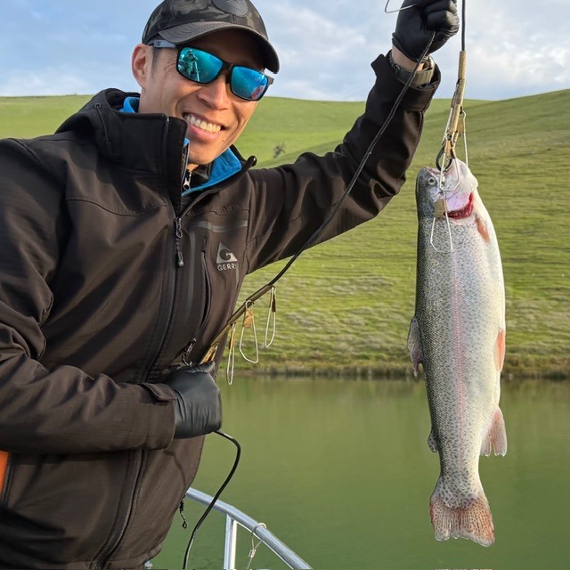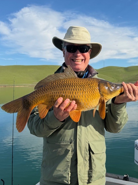 Paul Clouse, Al Hurwitz, and Abel Wong trolled several coves on both sides of Los Vaqueros Reservoir on January 22, 2026, catching eight and keeping seven good sized Mt. Lassen Rainbow Trout (one was released). Paul also hooked into a beautiful 8+ pound gold-colored Carp which fought very long and hard, and was also released. Pictured are two of the larger Rainbows weighing around 4.1 pounds and 3.7 pounds, the large Carp, and the group of us on the dock holding the seven Rainbows. The total weight of the seven Trout was close to 20 pounds.