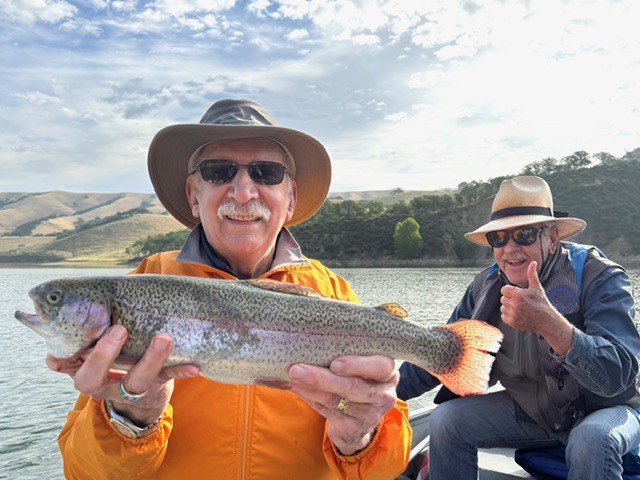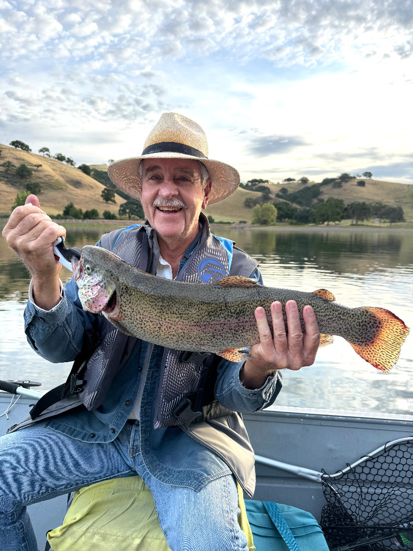 Ted Cribari, Al Hurwitz, and Kim Middlebrooks trolled Lake Del Valle (LDV), thinking we would be hitting various Bass species. Instead we were rewarded with some beautiful Rainbow Trout. Pictured here are two pictures of Kim with a large 5.8 pound Mt. Lassen Rainbow, and one shot of Ted with another 2.9 pound Rainbow. Kim ‘s Trout was a career best! Al hooked up with what appeared to be a nice 2-3 pound Rainbow, but the fish spit the hook about 10 yards from the boat.
