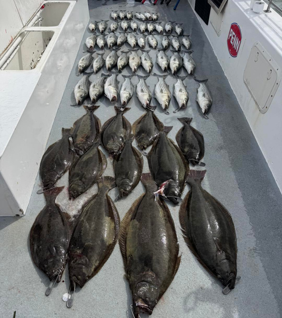 We took full limits of striped bass and a few for the crew and got a the best shot on the halibut so far this season. Bait is pouring into the bay and the halibut are following it in.